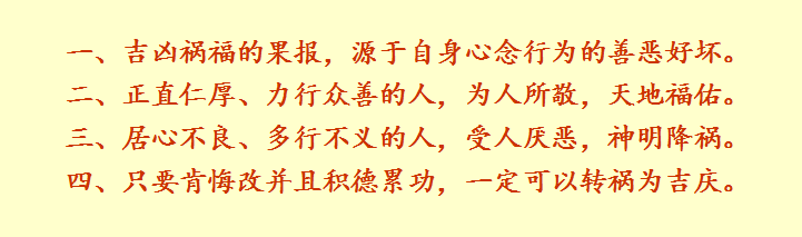 注:下文中章目及标题是注释者为了便于理解和查阅所加,不属于原文。 一、全篇总纲【太上曰:祸福无门,惟人自召;善恶之报,如影随形。】 太上老君说:祸与福的降临,没有别的缘由,全都是自己的身(行为)语(言语)意(思想)招感而来。身(行为)语(言语)意(思想)的善恶之报应,就如同影子紧随着身形相应而动,作恶遭祸,为善获福 。 〔太上老君〕道教对老子的尊称,又称“道德天尊”。〔祸福无门〕祸福之来,人所自召,有何门路? 人的一生,总是想避祸趋福,但却常常事与愿违。那么,究竟怎么样才能够免祸而获福呢?《太上感应篇》就是专门讲这个道理,而且具体教导人们如何切实地履行,以达到免祸而获福之目的。 “祸福无门,惟人自召;善恶之报,如影随形”,这一句是全篇总纲,揭示了祸福与恶善之间的因果关系——因感而果应(所以称之为“感应篇”)。祸福的降临,没有别的缘由,全都是自己作恶为善招来的。遭祸是因为作恶,而获福是由于为善。种瓜得瓜,种豆得豆;如是因,如是果,毫厘不爽。无论是祸是福,都是各人自作自受(自作因,自受果)。人若常将“因果”二字省察于中,自然祸灭而福生矣。 《太上感应篇》详细地列出:什么是善,什么是恶;怎样做,会获福;怎样做,会遭祸。依之而行,祸必远离,福必降临。故文昌帝君曰:“今劝世人,每日诵太上感应篇一遍,遵以修行;及书写一帙,日夕瞻视,依此修行。行之二年,万罪消灭;行之四年,百福皆集;行之七年,子孙贤明,荣登科第;行之十年,寿命延长;行之十五年,万事如意;行之二十年,子孙为卿相;行之三十年,注名僊籍;行之五十年,天神恭敬,名列僊班。不依此加意修行,或作或辍,今日行,明日废;人事既乖,心田日暗,虽口诵经,而其心不悟,是为渎天,罪不容赦。” 在依之而行中,切忌“或作或辍,今日行,明日废”,功夫贵在坚持不懈,始终如一。这是每一个修行人务必警惕之处。 《太上感应篇图说》云:“人心寂然不动,理、欲未形(天理人欲未形成),无理、欲,自无吉凶。及发而见诸事(及至天理、人欲生发而有其思想、言语及行为),则吉缘理生(则吉福缘于天理而生),凶缘欲集(凶祸缘于人欲而集),如种瓜得瓜,种豆得豆,自然而不可易。是(此)祸福之来,人所自召,有何门路?古人所以昼勤三省,夜惕四知,戒慎恐惧于不睹不闻之际(戒慎恐惧于人所不见不闻之际),无非趋福避祸之意耳。” 〔三省〕经常从身语意三个方面来检查(反省)自己;亦指每日多次自觉地检查自己。〔四知〕天知,神知,我知,子(你)知。《后汉书·杨震传》记载:杨震,字伯起,东汉时弘农郡华阴县人。他为人公正廉洁,不谋私利,是难得的清官。杨震在赴任东莱太守途中,路经昌邑。当时的昌邑县令王密,是他任职荆州刺史时提拔的官员。王密听说杨震路过本地,为报答当年杨震的提携之情,于是白天去谒见杨震,晚上则准备了白银十斤想赠送给杨震。杨震对他说:“我们是老朋友,我很了解你的为人,你却不了解我,为什么呢?”王密说:“现在是深夜没有人知道。”杨震说:“天知、神知、我知、子(你)知,怎么能说没有人知道呢?”王密听完后,惭愧的离开。 在断恶修善时,要特别注意善恶有身(行为)、口(言语)、意(思想)三类。而人们在断恶时,往往只重视身恶,而轻视口恶、忽视意恶。实际上,口恶和意恶所造的恶业是非常可怕的,因为口恶发生的频率远高于身恶,而意恶的频率更是高得多,甚而至于“意恶幢幢”;而且身、口之善恶,是源于意之善恶。这在《俞净意公遇灶神记注释》中有详细的解说,在《集福消灾之道》中有很生动的事例。所以,不但要断除身恶,而且要断除口恶和意恶;不但要增长身善,而且要增长口善和意善。要做到乐善好施,疾(憎恨)恶(对自己的过恶)如仇。 〔身口意〕身,指行为;口,指话语;意,指思想。 人未起念时,此心湛然清净,无善无恶。念头才动,循理者善,违理则恶。起初不过是一念、一言、或一行,日积月累,即有善人、恶人之区分,获福、遭祸之果报。究其根源,是福还是祸,全都取决于当初起的是善念还是恶念。所以,千万要小心自己的起心动念啊! 宋代灵源禅师对伊川先生说道:祸能生福,福也能生祸。祸之所以能生福,是因为人处于危难之时,急切地想要平安,而深究平安之理,尤其是能够一心敬畏谨慎;福之所以能生祸,是因为人居于安乐之时,纵容贪婪奢侈之念,而放肆其骄慢懈怠,尤其是经常轻忽侮慢也。(这是说:敬畏谨慎,祸能生福;骄慢懈怠,福能生祸。)
