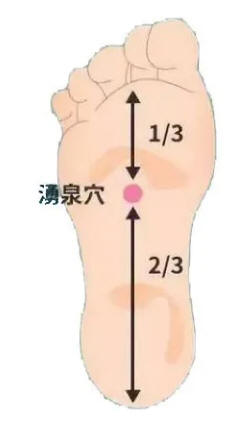 足的大拇指外缘往脚跟方向走,有一块隆起的骨头称之为包骨(如下面左图箭头所标示)。小腿抽筋时,仰卧在床上,用一脚脚底的涌泉穴(如下面右图所示)在另一脚的包骨上按揉100下,然后两脚互换同样按揉100下,可以缓解抽筋。