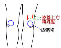 如果是膝盖尚未治愈,又必须上下楼梯,有一个权宜之法:手扶栏杆,退步下楼梯。也就是,下楼梯时,面向楼上,一步一步地退着下楼梯,但要特别注意安全。这一方法,也很适合将息未愈的膝盖,以缩短疗愈的时间。 另一位朋友介绍经验说:按揉原始点来治疗膝盖痛,也是很有效的方法。他说:“手握成拳,用中指节按揉膝盖原始点(如下图红线上的点),特别是把这些原始点中的痛点按揉得不痛,膝盖也就不痛了。”