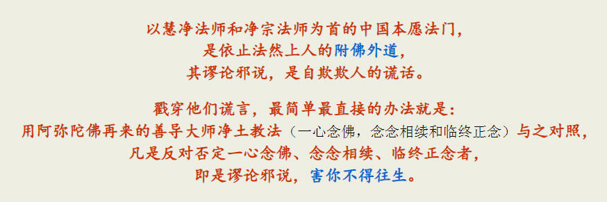 本愿法门大肆鼓吹的“称名必生”,源于法然上人的四句偈:“正定之业者,即是称佛名,称名必得生(称名必生),依佛本愿故。”(《法然上人全集》) 此偈也收集在广为流传的《法然上人念佛安心法语》里列为篇首,是法然上人之名句。 本愿法门说:“‘正定业之文’可以说是《观经》、《观经疏(观经四帖疏)》的核心要领,也是净土宗的核心要领。法然上人得法、开宗(开创净土宗),就是依据‘正定业之文’。当法然上人第八遍读《观经疏》的时候,读到此文,眼前一亮,豁然明悟:一切众生之往生,在於称彼名号。‘称名必得生’(善导大师“正定业之文”哪里有“称名必得生”?! ),为什麽?‘依佛夲愿故’。所以,这四句话也是法然上人开宗的结论。法然上人撰写《选择集》(《选择本愿念佛集》),最後的结论就归於这四句话。”由此可知,法然上人这四句偈是本愿法门的根! 中国本愿法门(冒牌“净土宗”)慧净法师在《念佛安心法语》的篇首写道:法然上人“依据弥陀化身之善导大师的净土思想开创了日本净土宗。法然上人得到善导大师的心髓,从善导大师的‘正定业之文’契入净土宗。”并将法然上人这四句偈(“正定之业者,即是称佛名,称名必得生(称名必生),依佛本愿故。”)作为法语头条。 中国本愿法门(冒牌“净土宗”)净宗法师在讲解这四句偈时说道:“这四句偈,可以讲是我们净土门的总纲要。”(《‘念佛安心法语’讲解(视频)》)然而,这个所谓的“净土法门总纲要”却是法然上人捏造出来的谎言!(可笑吧?) 净宗法师还说道:“大家弘法也好,自己修学也好,有广有略。有时候太广泛,反而不能抓住要点,人家听得也容易糊涂。所以,自己修学、为他人讲解,你能把握这四句偈,就算抓住了纲宗。”(《‘念佛安心法语’讲解(视频)》) 〔念佛安心法语〕慧净法师从《法然上人全集》精心辑录出48条法语,命其名曰《念佛安心法语》,作为中国本愿法门指导思想的核心,便于门人和信众日常熏习。净宗法师等人大肆鼓吹和宣讲《念佛安心法语》,有许许多多文章、讲话和视频。