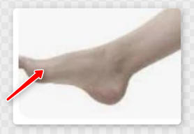 足的大拇指外缘往脚跟方向走,有一块隆起的骨头称之为包骨(如下面左图箭头所标示)。小腿抽筋时,仰卧在床上,用一脚脚底的涌泉穴(如下面右图所示)在另一脚的包骨上按揉100下,然后两脚互换同样按揉100下,可以缓解抽筋。