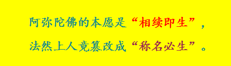 而法然上人却别有用心地把善导大师这一开示,砍掉最为关键的“一心”二字和“念念不舍(每一念都不被妄念牵离)”,篡改成: “正定之业者,即是称佛名,称名必得生,依佛本愿故。”(《法然上人全集》) 这里,法然将阿弥陀佛的本愿篡改成“称名必得生(称名必生)”! 请问:善导大师这段开示,哪里说过“称名必得生”?!